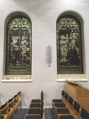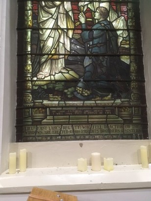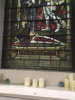 Base: TO THE GLORY OF GOD & IN LOVING MEMORY OF JOHN H. J. BARKER LIEUT EAST LANCS REGT (TF) WHO FELL IN ACTION IN THE/ GALLIPOLI PENINSULA AUGUST 7TH 1915 AGED 22 YEARS THESE WINDOWS ARE ERECTED BY HIS PARENTS BROTHERS & SISTERS Left Light: PUT ON THE WHOLE ARMOUR OF GOD THAT YE MAY/ BE (...) STAND AGAINST THE WILES OF EVIL RIGHT LIGHT: BE THOU FAITHFUL UNTO DEATH AND/ I WILL GIVE THEE A CROWN OF LIFE