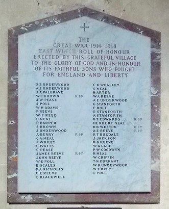 THE / GREAT WAR 1914 -1918 / EAST WINCH ROLL OF HONOUR / ERECTED BY THIS GRATEFUL VILLAGE / TO THE GLORY OF GOD AND IN HONOUR / OF ITS FAITHFUL SONE WHO FOUGHT / FOR ENGLAND AND LIBERTY.