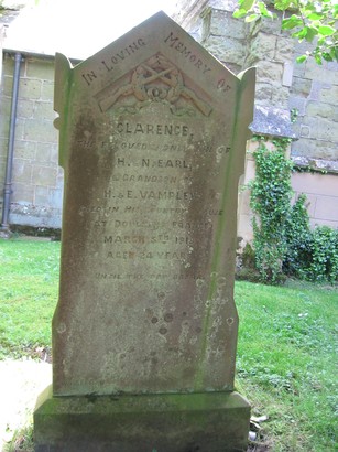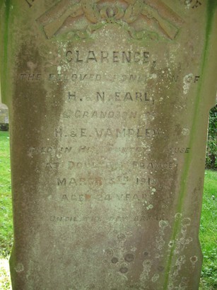 In Loving Memory Of/ Clarence,/ The Beloved Only Son Of/ H.& N. Earl,/ & Grandson Of/ H.& E. Vamplew,/ Died In His Countrys Cause/ At Doullens, France/ March 5th 1919,/ Aged 24 Years./ Until The Day Break