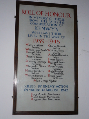 Roll of Honour in memory of those from this parish and congregation of Kenwyn who gave their lives in the war of 1939 - 1945 /names/. Killed by enemy action in Truro 6th August 1942.