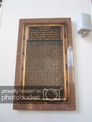 SACRED/TO THE MEMORY OF THE/MEMBERS AND ADHERENTS/OF THIS CHURCH WHO MADE/THE SUPREME SACRIFICE/IN THE GREAT WAR 1914-1919/[27 names]