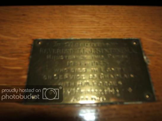 IN MEMORIAM/REVEREND TCJ SINTON M.A. /MINISTER OF THIS PARISH/1935- 1943/WHO DIED IN EGYPT/ON SERVICE AS CHAPLAIN/WITH H.M. FORCES/23RD OCTOBER 1943/AMEN