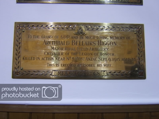 TO THE GLORY OF GOD AND IN MOST LOVING MEMORY OF/ARCHIBALD BELLAIRS HIGGON/MAJOR ROYAL FIELD ARTILLERY/CHEVALIER OF THE LEGION OF HONOUR/KILLED IN ACTION NEAR NO 3 POST, ANZAC. SEPT. 9. 1915, AGED 35/THIS IS ERECTED BY HIS WIFE ISOBEL/"MEA GLORIA FIDES"