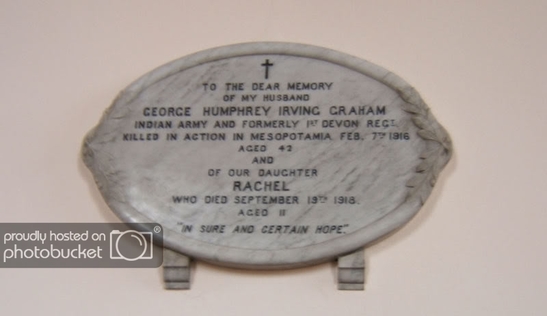 +/TO THE DEAR MEMORY/OF MY HUSBAND/GEORGE HUMPHREY IRVING GRAHAM/INDIAN ARMY AND FORMERLY 1ST DEVON REGT/KILLED IN ACTION IN MESOPOTAMIA, FEB. 7TH 1916/AGED 43/AND/OF OUR DAUGHTER/RACHEL/WHO DIED SEPTEMBER 19TH 1918/AGED 11/"A SURE AND CERTAIN HOPE"