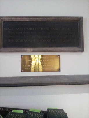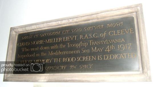 DULCE ET DECORUM EST PRO PATRIA MORI/CLAUD NORIE-MILLER LIEUT R.A.S.C. of CLEEVE/Who went down with the Troopship TRANSYLVANIA/torpedoed in the Mediterranean Sea MAY 4th 1917./IN WHOSE MEMORY THE ROOD SCREEN IS DEDICATED/REQUIESCAT IN PACE