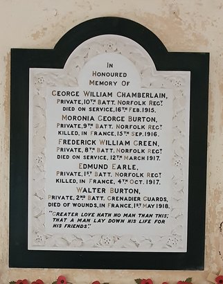 (WW1) -- Moronia George BURTON, Walter BURTON, George William CHAMBERLAIN, Edmund EARL, Frederick William GREEN. -- (WW2) -- Hubert Arthur FRANCIS.