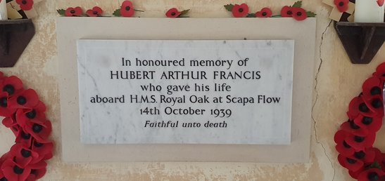 (WW1) -- IN / HONOURED / MEMORY OF / (5 names, rank, battalion, regiment and date of death) / "GREATER LOVE HATH NO MAN THAN THIS; / THAT A MAN LAY DOWN HIS LIFE FOR / HIS FRIENDS." // (WW2) -- In honoured memory of/ HUBERT ARTHUR FRANCIS / who gave his life / aboard H.M.S. Royal Oak at Scapa Flow / 14th October 1939 / Faithful unto death