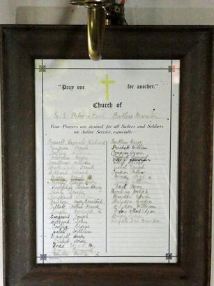 "PRAY ONE FOR ANOTHER." / S.S. PETER & PAUL BUTLERS MARSTON / YOUR PRAYERS ARE DESIRED FOR ALL SAILORS AND SOLDIeRS / ON ACTIVE SRVICE, ESPECIALLY:- / (Names)