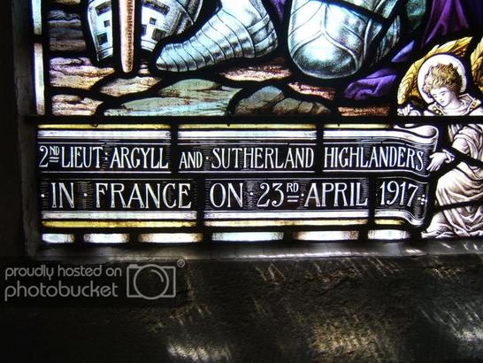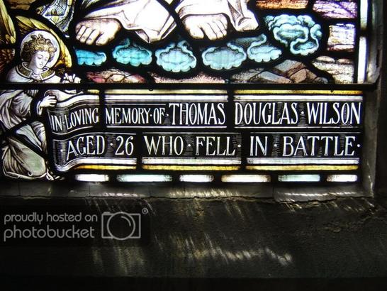 Tracery-Be thou faithful unto death and/I will give thee a/crown of life Left Hand Light-IN LOVING MEMORY OF THOMAS DOUGLAS WILSON/AGED 26 WHO FELL IN BATTLE Right Hand Light-2ND LIEUT ARGYLL AND SUTHERLAND HIGHLANDERS/IN FRANCE ON 23RD APRIL 191