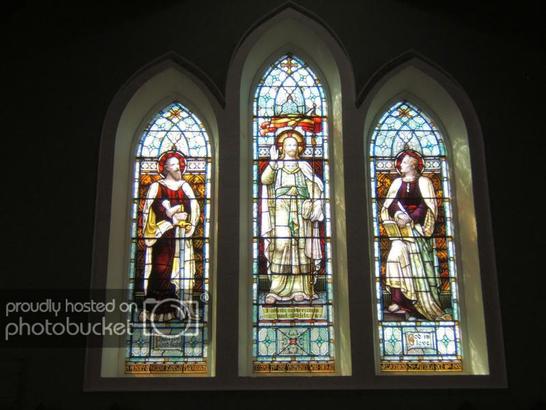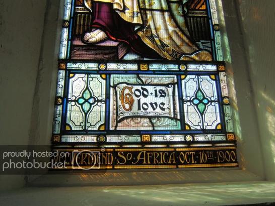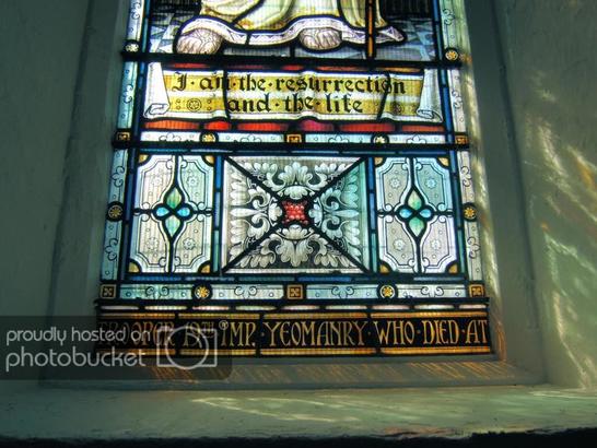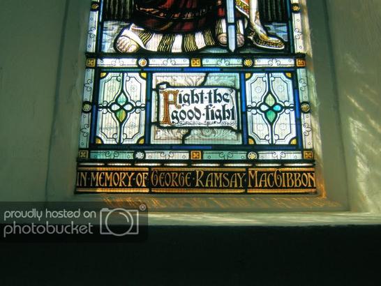 Left Hand Light-Fight the/good fight/IN MEMORY OF GEORGE RAMSAY MACGIBBON Central Light-I am the resurrection/and the life/TROOPER 19TH IMP. YEOMANRY WHO DIED AT Right Hand Light-God is/love/WELVERDEND SO. AFRICA OCT 16TH 1900