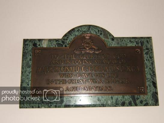TO THE GLORY OF GOD/AND IN LOVING MEMORY OF/MAJOR REGINALD G GORDON D.S.O. R.G.A./WHO GAVE HIS LIFE/IN THE GREAT WAR 1914-1918/AGED 39 YEARS