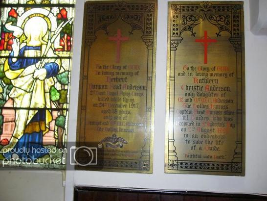 +/To the Glory of GOD/In loving memory of/Herbert/Norman Scott Anderson/2nd Lieut Royal Flying Corps,/killed while flying/on 24th December 1917,/aged 18 years,/only son of/Bridget and M.C. Anderson/The Hollies, Kinross