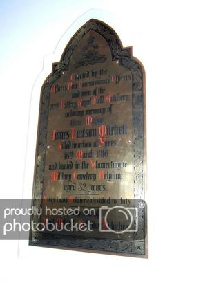 Erected by the/Officers, Non-Commissioned Officers/and men of the/112th Battery Royal Field Artillery/in loving memory of/their Major/James Lawson Mitchell/killed in action at Ypres/16th March 1916/and buried in the Vlaarnertinghe/Military Cemetery, Belgium/aged 32 Years/A very brave Soldier & devoted to duty/Only son of/Hugh Mitchell.... Pitlochry