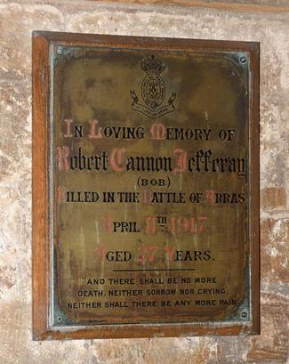 IN LOVING MEMORY OF / ROBERT CANNON JEFFERAY / (BOB) / KILLED IN THE BATTEL OF ARRAS / APRIL 11TH 1917 / AGED 27 YEARS / "AND THERE SHALL BE NO MORE / DEATH, NEITHER SORROW NOR CRYING / NEITHER SHALL THERE BE ANY MORE PAIN"