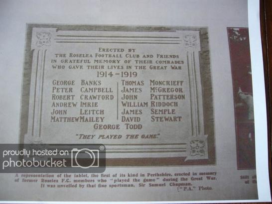 ERECTED BY/THE ROSELEA FOOTBALL CLUB AND FRIENDS/IN GRATEFUL MEMORY OF THEIR COMRADES/WHO GAVE THEIR LIVES IN THE GREAT WAR/1914-1919/[13 names in 2 columns]/"THEY PLAYED THE GAME"