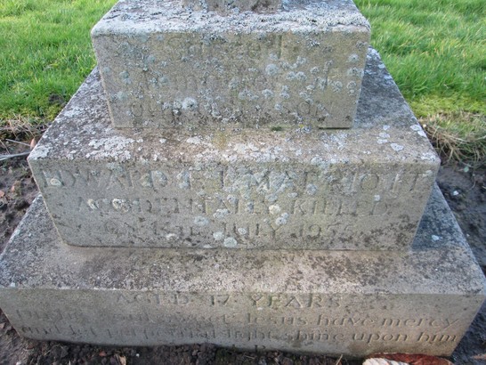 Sacred Memory of Our Only Son, Edward Marriott accidentally killed on 14th July 1955, aged 17 years, On his soul sweet Jesus have mercy and let perpetual shine upon him. Francis Brandon grandfather killed November 1917 at Mons. (not on photograph recorded MI)