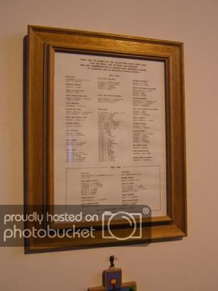 THESE ARE THE NAMES OF THE FALLEN WHO GAVE THEIR LIVES/THAT WE MIGHT LIVE IN PEACE ABD FREEDOM/AND ARE COMMEMORATED IN VARIOUS WAR MEMORIALS WITHIN/ST ANDREW'S AND ST MICHAEL'S PARISH CHURCH/1914-1918/[names in 3 columns]/1939-1945/[names in 2 columns]/"WE WILL REMEMBER THEM"