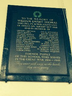 TO THE MEMORY OF WILLIAM EWART THOMAS WHO FELL IN ACTION SOUTH EAST OF ARRAS ON AUGUST 28TH 1918 AND IN HONOUR OF GRIFFITH J. BEYNON CECIL LEONARD ALUN BOWEN KENNETH LLOYD MEURIG BOWEN BRINLEY MORGAN ANEURIN DANIEL TUDOR LL. MORGAN W. BRINLEY DAVIES SYLVANOG ROSSER DEWI EDWARDS IDRIS REES JOHN MORGAN EDWARDS FRED THOMAS CAREY EDWARDS W. ELIAS THOMAS SAMUEL HICKS GRIFFITH THOMAS THOMAS JOHN JONES D. AMMAN WILLIAMS TEDDY JONES W. MORGAN WILLIAMS TUDOR JONES RUSSELL WILLIAMS FORMER PUPILS OF THIS SCHOOL WHO SERVED IN THE GREAT WAR 1914-1918 “They went with songs to the battle. They were young.”