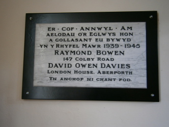 ER COF ANNWYL AM/ AELODAU O'R EGLWYS HON/ A GOLLASANT EU BYWYD/ YN Y RHYFEL MAWR 1939-1945/ RAYMOND BOWEN/ 147 COLBY ROAD/ DAVID OWEN DAVIES/ LONDON HOUSE ABERPORTH/ YN ANCHOF NI CHANT FOD