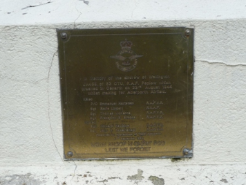 IN MEMORY OF THE AIRCREW OF WELLINGTON/ JA 453 OF 83 O.T.U. R.A.F. PEPLOW WHICH/ CRASHED IN CENARTH ON 23RD AUGUST 1944/ WHILST MAKING FOR ABERPORTH AIRFIELD/ KILLED/ (NAMES)/ INJURED/ (NAMES)/ PRESENTED BY APPRENTICES OF T.E.E. ABERPORTH/ 4TH SEPTEMBER 1994/ MEWN ANGOF NI CHANTFOD/ LEST WE FORGET