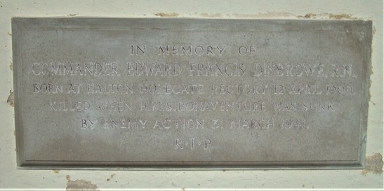 IN MEMORY OF COMMANDER EDWARD FRANCIS DISBROWE, R.N. BORN AT HALTON HOLEGATE RECTORY, 12 APRIL 1900 KILLED WHEN H.M.S. BONAVENTURE WAS SUNK BY ENEMY ACTION 31 MARCH 1941 R.I.P.