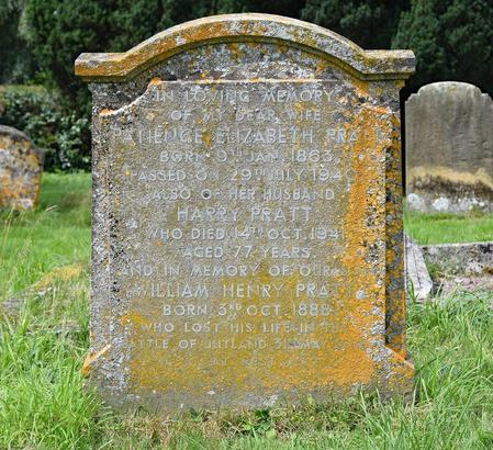 In Loving Memory of my dear wife/ Patience Elizabeth Pratt born 9th January 1863, passed on 29th July 1940./ Also of her husband Harry Pratt who died 14th Oct 1941 aged 77 years. And/ in Memory of our son William Henry Pratt born 3rd Oct. 1888, who lost his/ life in the Battle of Jutland 31st May 1916. At rest