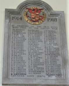 OWELL DYSG NA GOLUP/ 1914 1918/ IN MEMORY OF THE OLD BOYS/ WHO FELL IN THE GREAT WAR/ (Names)/ LLEWYRCHED EU GOLEUNI HYD BYTH (Translated: GREATER LOVE HATH NO MAN)