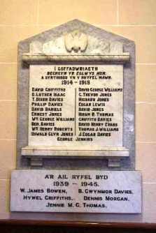 I GOFFADWRIAETH / BECHGYN YR EGLWYS HON / A SYRTHIODD TN Y RHYFEL MAWR / [NAMES] / A'R AIL RYFEL BYD / 1939-1945. /