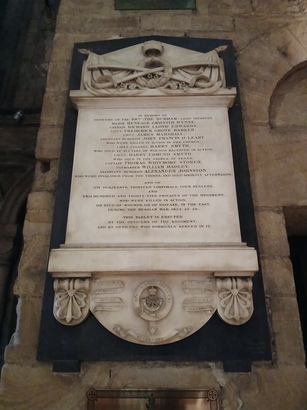 IN MEMORY OF/OFFICERS OF THE 68TH (THE DURHAM) LIGHT INFANTRY/ (names) /AND OF/SIX SERGEANTS, 13 CORPORALS, 4 BUGLERS/AND/ TWO HUNDRED AND THIRTY FIVE PRIVATES OF THE REGIMENT/WHO WERE KILLED IN ACTION/OR DIED OF WOUNDS, OR OF DISEASE IN THE EAST/ DURING THE RUSSIAN WAR 1854-55-56./THIS TABLET IS ERECTED/BY THE OFFICERS OF THE REGIMENT/AND BY OFFICERS WHO FORMERLY SERVED IN IT