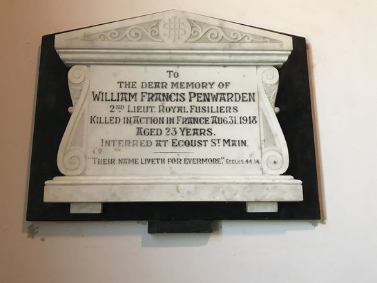 To THE DEAR MEMORY OF WILLIAM FRANCIS PENWARDEN 2ND LIEUT:ROYAL FUSILIERS KILLED IN ACTION IN FRANCE AUG 31 1918 AGED 23 YEARS INTERRED AT ECOUST ST MAIN "THEIR NAME LIVETH FOR EVERMORE" ECCLUS 44:14