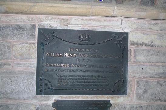 IN MEMORY OF WILLIAM HENRY FARRINGTON WARREN D.S.O. COMMANDER, ROYAL AUSTRALIAN NAVY BORN 19TH OCTOBER 1877 DROWNED AT BRINDISI 13 APRIL 1918. "HERE OR HEREAFTER YOU SHALL SEE IT ENDED/THIS MIGHTY WORK TO WHICH YOUR SOULS ARE SET/IF FROM BEYOND THEN WITH THE VISION SPLENDID/YOU SHALL SMILE BACK AND NEVER KNOW REGRET" [PLAQUE BELOW] THE ABOVE MEMORIAL IS ERECTED BY HIS BROTHERS AND THE OFFICERS AND MEN OF THE AUSTRALIAN DESTROYER FLOTILLA UNDER HIS COMMAND