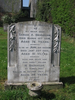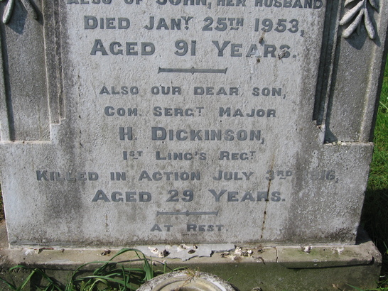 In Loving Memory/ of/ MY DEAR WIFE,/ SARAH A. DICKINSON,/ DIED MARCH 12TH 1936,/ AGED 76 YEARS./ ALSO OF JOHN, HER HUSBAND/ DIED JANY. 25TH 1953,/ AGED 91 YEARS./ ALSO OUR DEAR SON,/ COM. SERGT MAJOR/ H. DICKINSON/ 1ST LINC’S REGT./ KILLED IN ACTION JULY 3RD 1916,/ AGED 29 YEARS./ AT REST.