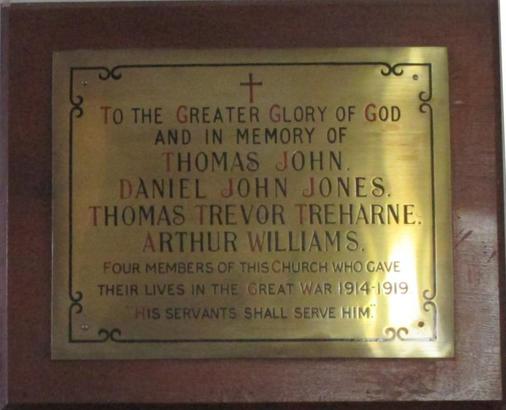 TO THE GREATER GLORY OF GOD/ AND IN MEMORY OF/ (Names)/ FOUR MEMBERS OF THIS CHURCH WHO GAVE/ THEIR LIVES IN THE GREAT WAR. 1914-1919/ "HIS SERVANTS SHALL SERVE HIM"