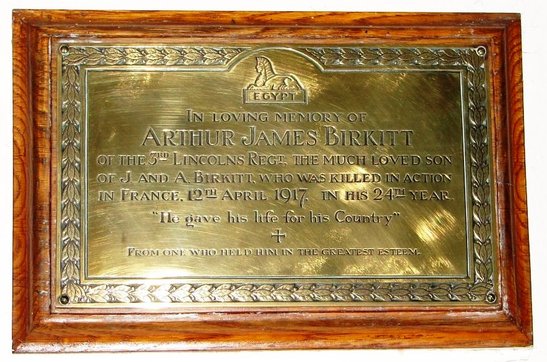 IN LOVING MEMORY OF/ ARTHUR JAMES BIRKITT/ OF THE 3RD LINCOLNS REGT. THE MUCH LOVED SON/ OF J. AND A. BIRKITT, WHO WAS KILLED IN ACTION/ IN FRANCE, 12TH APRIL 1917. IN HIS 24TH YEAR/ "He gave his life for his Country"/ +/ FROM ONE WHO HELD HIM IN GREAT ESTEEM.