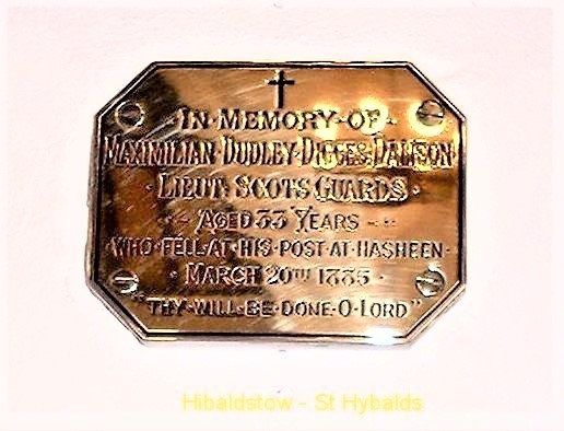 IN MEMORY OF/ MAXIMILLIAN DUDLEY DIGGES DALISON/ LIEUT. SCOTS GUARDS/ AGED 33 YEARS/ WHO FELL AT HIS POST AT HASHEEN/ MARCH 20TH 1885/ THY WILL BE DONE O LORD