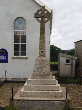 THIS MONUMENT HAS BEEN ERECTED BY THE INHABITANTS OF PONTHENRY. TO THE GLORY OF GOD AND TO THE SACRED MEMORY OF/ (NAMES)/ WHO FELL DOING THEIR DUTY IN THE GREAT WAR 1914 - 1919/ "THEY DIE NOT WHO LIVE IN THE MEMORY OF THOSE THAT LOVE THEM 1939 - 1945/ (NAMES)" (EXACT LINE SPACING UNKNOWN)