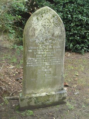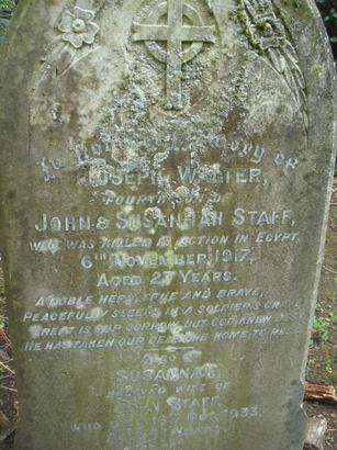 In Loving Memory of / JOSEPH WALTER / FOURTH SON OF / JOHN & SUSANNAH STAFF, / WHO WAS KILLED IN ACTION IN EGYPT / 6TH NOVEMBER 1917, / AGED 27 YEARS. / A NOBLE HERO, TRUE AND BRAVE, / PEACEFULLY SLEEPS IN A SOLDIERS GRAVE, / GREAT IS OUR SORROW, BUT GOD KNEW BEST, / HE HAS TAKEN OUR DEAR ONE HOME TO REST. / ALSO OF / SUSANNAH / THE BELOVED WIFE OF / JOHN STAFF, / WHO DIED 16TH OCT. 1933, / AGED 77 YEARS. / AT REST.