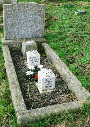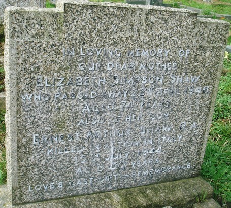 IN LOVING MEMORY OF/ OUR DEAR MOTHER/ ELIZABETH SIMPSON SHAW/ WHO PASSED AWAY 22ND APRIL 1946/ AGED 74 YEARS/ ALSO OF HER SON/ ERNEST ARTHUR SHAW. R.A./ KILLED IN ACTION IN ITALY/ 15TH JULY 1944/ AGED 30 YEARS. / LOVES LAST GIFT – REMEMBRANCE