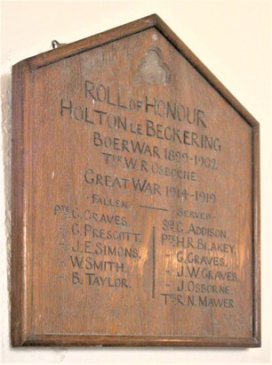 ROLL OF HONOUR HOLTON LE BECKERING BOER WAR 1899-1902 TPR W.R. OSBOURNE GREAT WAR 1914-1918 FALLEN SERVED PTE C. GRAVES SGT G. ADDISON " G. PRESCOTT PTE H.R. BLAKEY " J.E. SIMONS " G. GRAVES " W. SMITH " D. OSBORNE " R. TAYLOR " J.W. GRAVES TPR N. MAWER