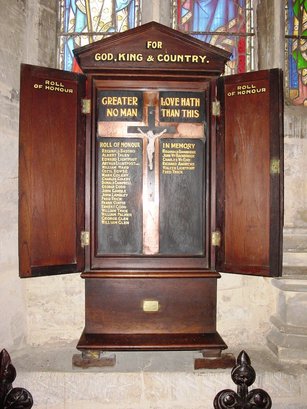 (First Column) ROLL OF HONOUR/ REGINALD BASTARD/ ALBERT TALES/ EDWARD LIGHTFOOT/ ARTHUR LIGHTFOOT RIP/ WILLIAM WARD/ CECIL DOWSE/ MARK COLEBY/ CHARLES COLEBY/ DONALD CAMPBELL/ GEORGE CODD/ JOHN GAMBLE/ JOHN LAMBLEY/ FRED THICK/ FRANK CURTIS/ ERNEST CODD/ WILLIAM THICK/ WILLIAM PALMER/ GEORGE GLEN/ WILLIAM GLEN (Second Column) REGINALD BAINBRIDGE/ JOHN Wm BAINBRIDGE/ CHARLED Wm EDIS/ RICHARD ANDREWS/ WALTER LIGHTFOOT/ FRED THICK