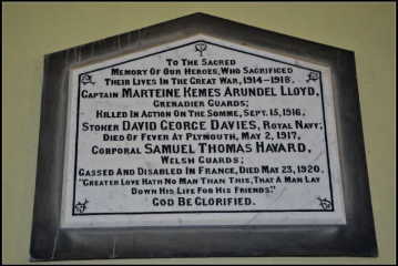 TO THE SACRED/ MEMORY OF OUR HEROES, WHO SACRIFICED/ THEIR LIVES IN THE GREAT WAR, 1914- 1918/ (NAMES)/ "GREATER LOVE HATH NO MAN THAN THIS, THAT A MAN LAY/ DOWN HIS LIFE FOR FRIENDS"/ GOD BE GLORIFIED