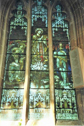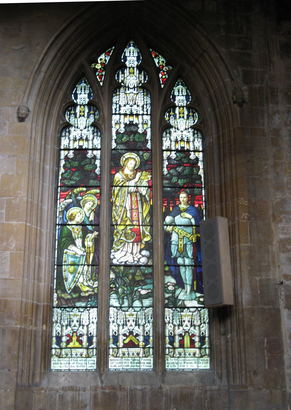 To the Glory of God and in loving/ memory of John Sydney Paulson/ B.Sc. 2nd Lieut. Lancashire Fusiliers/ killed in action at Bury-le-Long/ 14th Septr 1914 this window was/ erected by his Parents A.D 1919/ Be thou faithful unto/ death and I will give thee a Crown/ of Life. Rev.2.10.