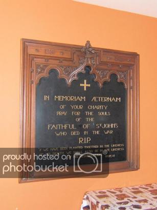 Plaque- +/IN MEMORIAM AERTERNAM/OF YOUT CHARITY/PRAY FOR THE SOULS/OF THE/FAITHFUL OF ST JOHN'S/WHO DIED IN THE WAR/R.I.P./"IF WE HAVE BEEN PLANTED TOGETHER IN THE LIKENESS/OF HIS DEATH WE SHALL ALSO BE IN THE LIKENESS/OF HIS RESURRECTION"/ROM. VI Roll of Honour-ST JOHN'S, PERTH/WAR MEMORIAL ROLL OF HONOUR/NAMES OF THE FALLEN IN ST JOHN'S/IN MEMORIAM/[names in 2 columns]