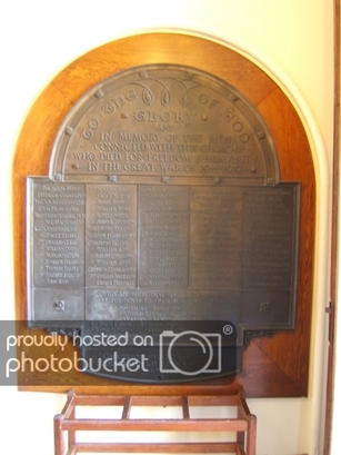 In the Dome-TO THE GLORY OF GOD/AND/IN MEMORY OF THE MEN/CONNECTED WITH THIS CHURCH/WHO DIED FOR FREEDOM & HUMANITY/IN THE GREAT WAR OF 1914-1919 Main Section-[Column 1] ROYAL NAVY/[names] ROYAL HIGHLANDERS/[names]/ [Column 2]- [continuation of Royal Highlanders Names]/GORDON HIGHLANDERS/[names]/ [Column 3]/[continuation of Gordon Highlanders names]/ROYAL SCOTS/[names]/ [Column 4] SEAFORTH HIGHLANDERS/[names]/SCOTS GUARDS/[names]/SCOTTISH RIFLES/[names]/ROYAL SCOTS FUSILIERS/[names]/ [Column 5]/ROYAL GARRISON ARTILLERY/[name]/ARMY SERVICE CORPS/[names]/MOTOR TRANSPORT/[names]/ROYAL WARWICKS/[names]/ROYAL ENGINEERS/[name] Plate below the names part-"WHO ARE THESE THAT FLY AS A CLOUD/AS THE DOVES TO THEIR WINDOWS" IS 60.8,/AUSTRALIAN EXPEDITIONARY FORCE/[names]/CANADIAN EXPEDITIONARY FORCE/[names in 3 columns] Base of Plaque-'GREATER LOVE HATH NO MAN THAN THIS/THAT HE LAY DOWN HIS LIFE FOR/HIS FRIENDS'