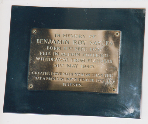 /IN MEMORY OF/BENJAMIN ROY SAYLES/BORN 11TH SEPT. 1920/FELL IN ACTION COVERING/WITHDRAWL FROM FLANDERS/31ST MAY 1940./"GREATER LOVE HATH NO MAN THAN THIS/THAT A MAN LAY DOWN HIS LIFE FOR HIS/FRIENDS./