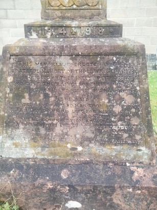 At base of cross shaft- 1914+1918 On plinth-THIS MEMORIAL IS ERECTED IN EVER/GRATEFUL MEMORY OF THOSE WHOSE NAMES/ARE INSCRIBED ON THE PANELS ON EITHER SIDE/WHO GAVE THEIR LIVES FOR THEIR COUNTRY/AND FOR TRUTH AND RIGHTEOUSNESS SAKE [sic]/JESUS SAID/GREATER LOVE HATH NO MAN THAN THIS/THAT A MAN LAY DOWN HIS LIFE FOR HIS FRIENDS/ST JOHN/I AM THE RESURRECTION AND THE LIFE, HE/THAT BELIEVETH IN ME THOUGH HE WERE DEAD/CHRIST OUR REDEEMER PASSED THE SELF SAME WAY