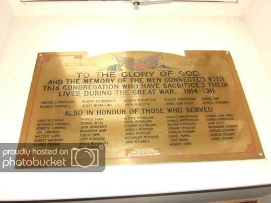 TO THE GLORY OF GOD/AND THE MEMORY OF THE MEN CONNECTED WITH/THIS CONGREGATION WHO HAVE SACRIFICED THEIR/LIVES DURING THE GREAT WAR 1914-1918/[names in 5 columns]/ALSO IN HONOUR OF THOSE WHO SERVED/[names in 5 columns] Small plaque at bottom centre- THIS MEMORIAL /WAS REMOVED FROM/DALGUISH CHURCH 1985