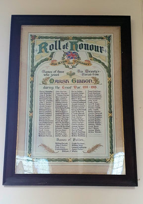 + Roll of Honour + / FOR KING AND COUNTRY / Names of those / who joined / His Majesty's / Forces from / MARSH GIBBON. / during the Great War. 1914 - 1918. / (Names in 4 columns) / Names of Fallen. / (9 Names) //