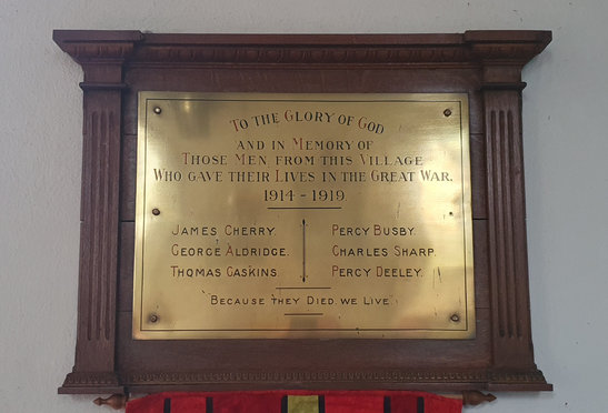 TO THE GLORY OF GOD / AND IN MEMORY OF / THOSE MEN FROM THIS VILLAGE / WHO GAVE THEIR LIVES IN THE GREAT WAR. / 1914 - 1919. / (6 NAMES in 2 columns) / "BECAUSE THEY DIED, WE LIVE." //