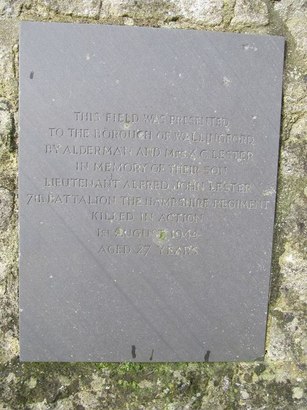THIS FIELD WAS PRESENTED TO THE BOROUGH OF WALLINGFORD BY ALDERMAN AND MRS A.C.LESTER IN MEMORY OF THEIR SON LIEUTENANT ALFRED JOHN LESTER 7TH BATTALION THE HAMPSHIRE REGIMENT KILLED IN ACTION 1ST AUGUST 1944 AGED 27 YEARS